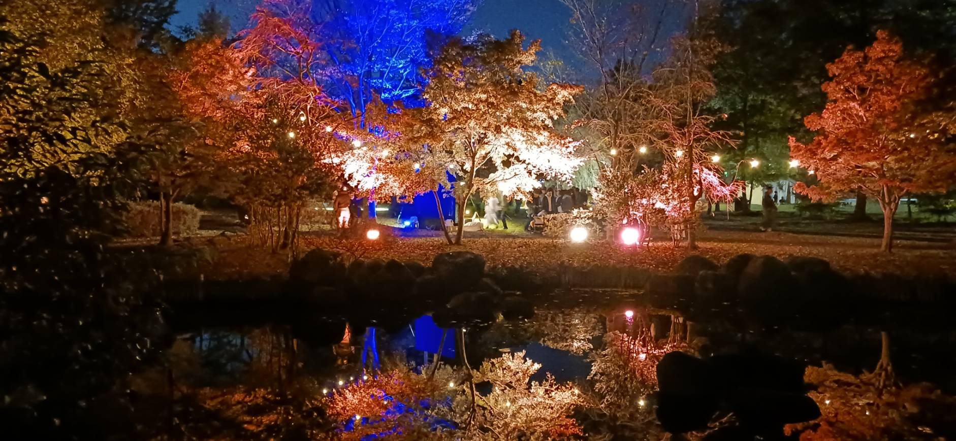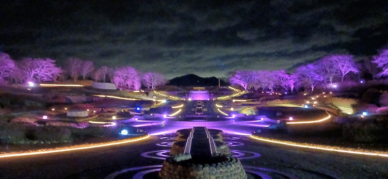 2025年4月4日。桜の木々をピンクの光でライトアップ。まるで桜が咲いているような幻想的な空間を演出。