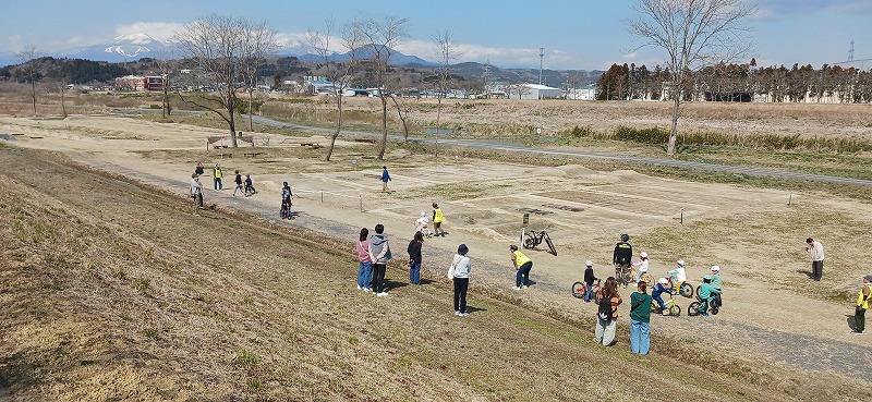 2025年3月23日。大河原町のMTBスパークで開かれた子どもと親の自転車補助輪外し教室。プロのMTBライダーからの指導の元、本格的に開催。