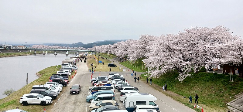 2025年4月13日。今年も白石川河川の桜が満開になりました。多くの人で賑わう。