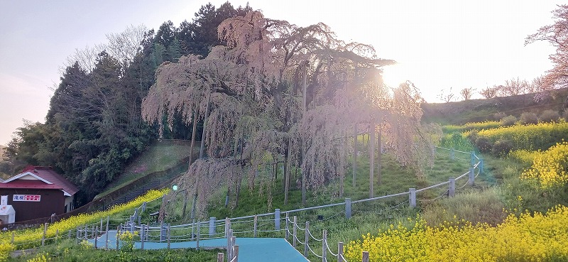 2025年4月21日。福島県三春の滝桜。満開は過ぎていましたが夕日に照らされて美しい光景を見せていました。