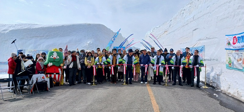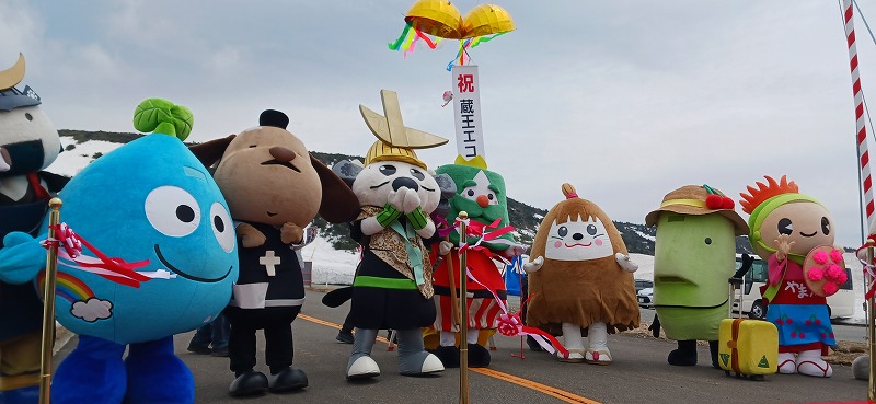 2025年4月25日。去年の11月から冬の眠りについていた宮城と山形を結ぶ山岳道路が開通。たくさんのゆるキャラが開通を祝福。