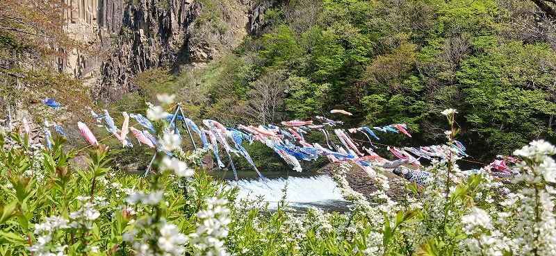 2025年4月27日。白石市小原の県指定天然記念物材木岩に彩られた約800匹のこいのぼり。白石川上空を彩る。