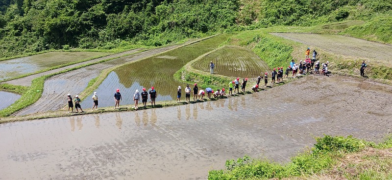 2025年5月29日。丸森町大張の沢尻の棚田で小学生の田植え体験を撮影しました。